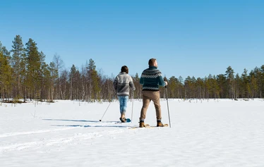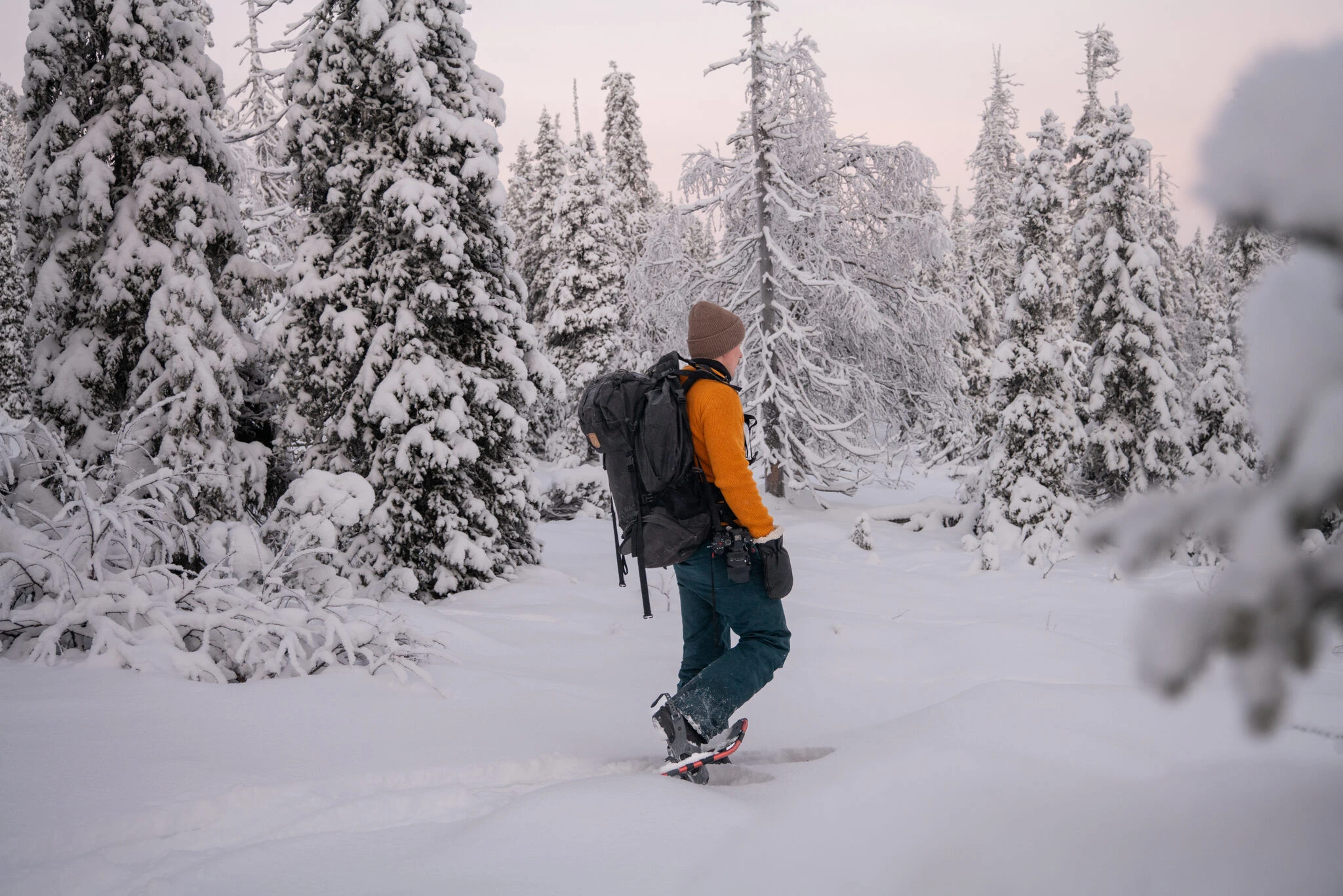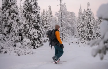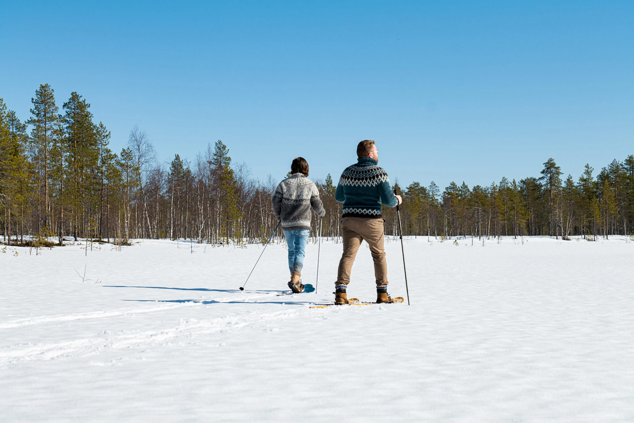 Let the snowshoes take you deep into Lapland's snowy world. Snowshoeing offers a unique opportunity to explore Lapland's stunning nature in places that are often hard to reach without snowshoes or cross-country skis. This unforgettable excursion is open to all ages, but the minimum age for participation is 10 years.