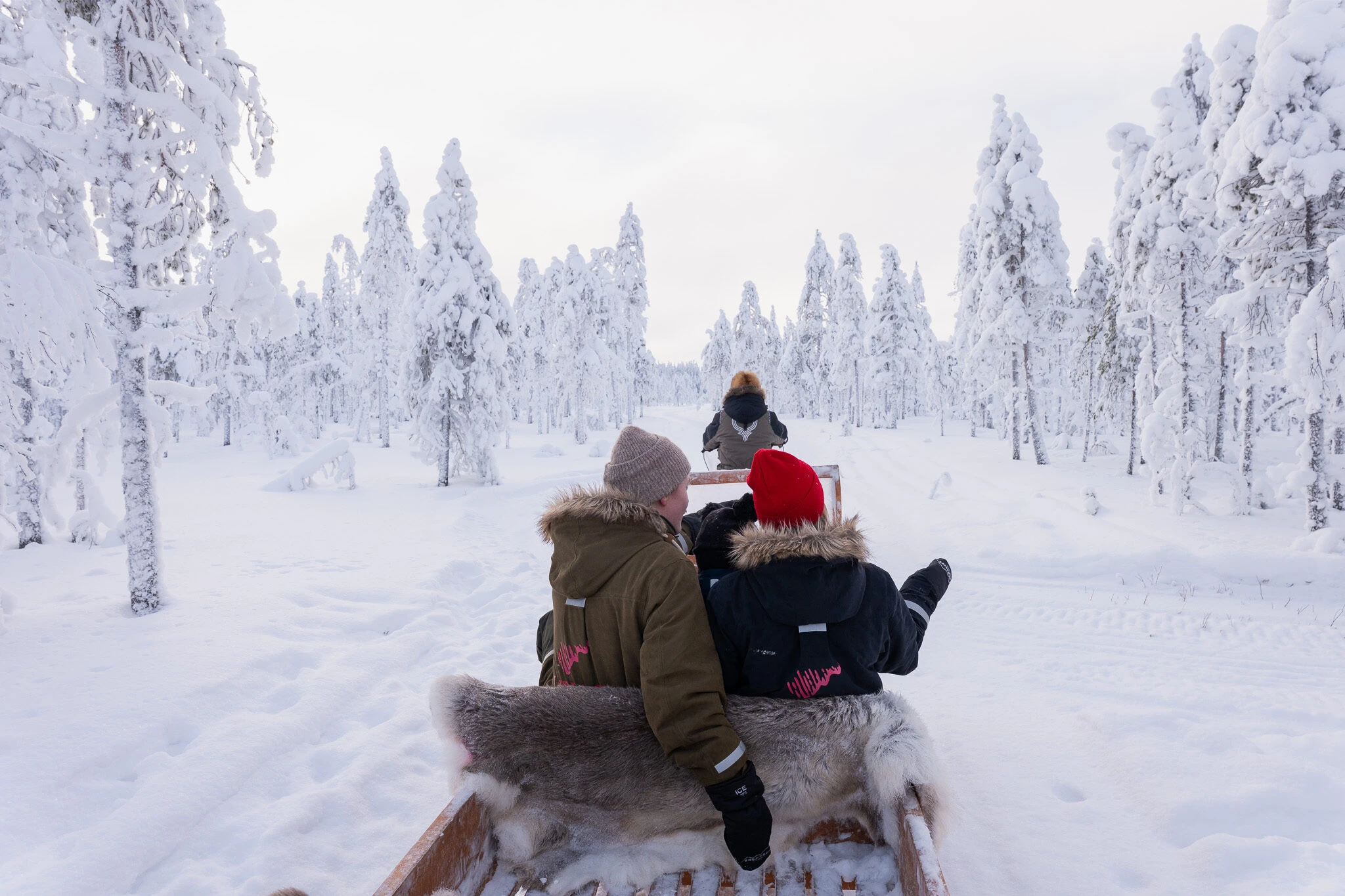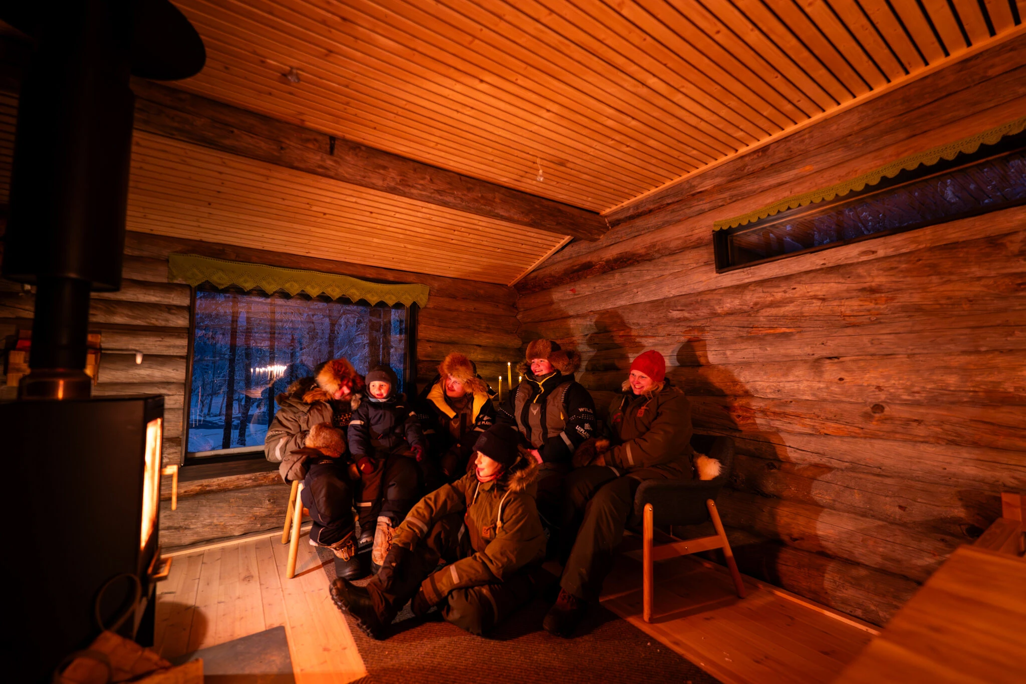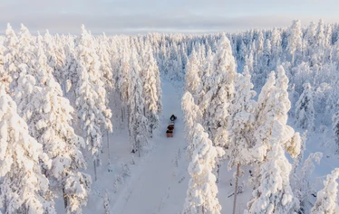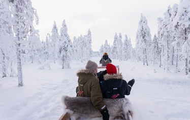 This experience takes place at our own lakeside activity park by a quiet wilderness lake, reserved for Lupland guests only. You will travel there in a snowmobile-pulled sleigh, sitting warm under reindeer hides as we go through the forest.