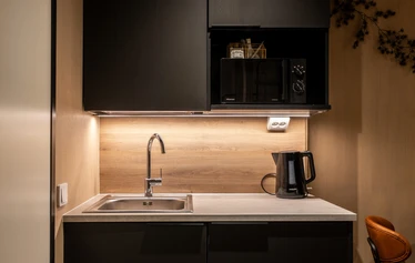 A mini kitchen equipped with a small induction stove, refrigerator, microwave,